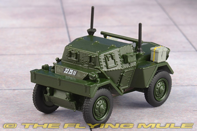 Previous releases on this British two-man light, fast, four-wheel drive reconnaissance vehicle have seen it as used in various military roles, particularly from WWII. It was also used by British Commonwealth and associated foreign units during the war and by other countries afterwards, well into the 1970s. Here we see it as deployed nearer home by the Royal Ulster Constabulary where one of its roles was serving in an anti-riot capacity assisting the British Army, although it was supplied with weaponry. The RUC had an army base at Keady near Belfast and the town was the centre of much action between the opposing factions during The Troubles. Registered 22 ZS II, our Scout Car is decorated in a dark green and brown camouflage scheme with dark green wheels and chassis. A rust finish has been applied to the exhausts and the aerial bases and aerials are black. A final detail sees the fuel cans in dark grey with olive green strapping.