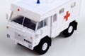 Oxford's Land Rover FC (Forward Control) ambulance in 1:76 scale, as it served in Bosnia as a 24 Field Ambulance. Registered as military vehicle 72 GJ 00, it is decorated completely in white with silver external trim and the Red Cross identity printed in red on all sides, including the roof. The roof carries a blue beacon and note that the back is solid, rather than "canvas". The interior is black and this model appears as a RHD (right hand drive) version.