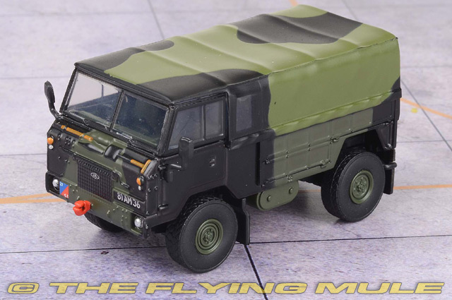 Back to our model -and its deployment with RAF Leuchars on the east coast of Scotland, where it was the home of 27th Squadron RAF amongst other RAF Squadrons along the way until 2015 when the station passed into the hands of the British Army. The model's camouflage scheme is supplemented with a dark green canvas back, repeated on the wheels. The interior is moulded in dark green too. The exterior military registration plate 81 AM 36 is positioned horizontally above the nearside front wing as well as under the rear window. Rounding off a wealth of detail on this model, the formation sign is printed in blue and red on the offside front bumper and nearside rear bumper.
