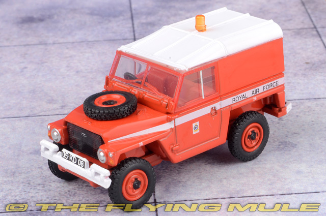 For their third release on the Land Rover 1/2 ton Lightweight, Oxford remains on a military theme, this time the RAF and their world-famous Red Arrows Aerobatic Team. Although the only graphics on the vehicle read Royal Air Force, the Team's distinctive signature red and white colour scheme is sufficient identity! Another giveaway is the Royal Air Force Scampton crest on the doors, which is the base for the Red Arrows team who are also full-time RAF pilots. Registered 05 KD 08, note the addition of a tow-hook on the rear bumper, a roof beacon on the hard top of this model, as well as the spare wheel on the bonnet.