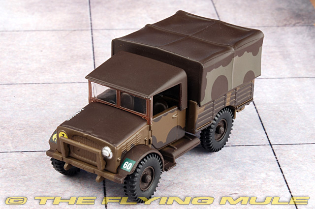 MWD was to provide the backbone of the British Army's transportation. It was used as a general cargo and personnel carrier, including wide usage in the North African Campaign as the standard transport for the motorised infantry in the armoured brigades. Its inclusion in our military series sees the latest version of the Bedford MWD in an unusual red-brown and olive drab camouflage scheme, as it served in Tunisia with the Grenadier Guards in December 1943. The canvas back is a slightly lighter olive green and the interior, chassis and the front bar all reflect the olive drab of the main bodywork. The bumpers are also in the red-brown tone of the body camouflage. The Grenadier Guards Battalion markings have been reproduced on the back and on the bonnet of the truck along with its identity number Z4760380.