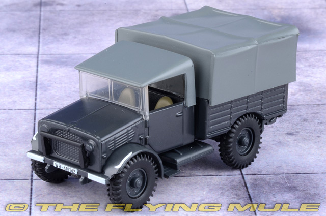 The Bedford MWD was the most used Allied transport vehicle between 1939 and 1945. It was manufactured by Vauxhall Motors who supplied vast numbers to the armed forces. Our latest release is a replica of one which fell into German hands, who registered it WH 416142. It is decorated in a dark black grey with slightly lighter grey canvas cab roof and rear canopy and a khaki coloured interior. A touch of white denotes the Div 215 badge and the front bumpers. It was unfortunate to lose one of these trucks to the enemy but they certainly got a very good vehicle!