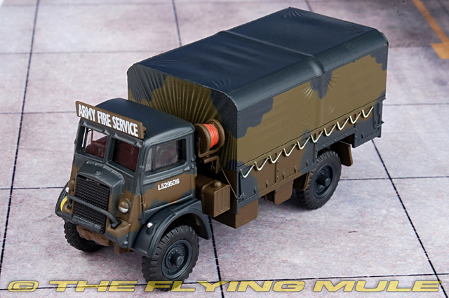 The QLD truck was manufactured by Bedford Vehicles in the UK between 1941 and 1945, for use by the British Armed Forces in the Second World War. The QLD was the GS (general service) cargo truck version of its QL prototype and was built to carry 12 persons - one driver and eleven passengers/army personnel. With a height of 10 feet (2/54m), it was 19 ft 8 in (5.99 m) long and had an operational range of 156 miles (250 km). Our first release on the new tool is as used by the British Army Fire Service, dressed in the earth brown/black grey camouflage scheme with a field drab camouflage scheme to the rear canopy. The Army Fire Service lettering in white is printed boldly above the front windscreen and additional military numbering is also printed in white on the cab sides and rear of the vehicle. One special addition comprises the hose reel positioned between the rear of the cab and the trailer section. Another detailed touch is the sand coloured rope tying the roof canopy down to the flatbed section along the length of the truck, particularly where it is "drawn tight" across the back with realistic folds of canvas. Silver mask spraying to the headlights and the black grey wheel inserts complete the model. The Bedford QLD is still a familiar site at the various military shows across the UK in particular, so you can look out for it on your next outing to compare it with our little 1:76 scale miniature.