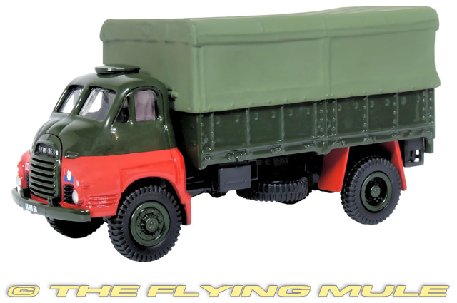 Oxford's second release of the Bedford RL in 1:76 scale shows it as it was used from the 1950s when the Bomb Disposal Units (UK) Royal Engineers moved their headquarters from Chatham to Broadbridge Heath near Horsham in West Sussex. Decorated in dark green with red masking to the front wings and rear mudguards, the canvas back is moulded in a slightly lighter green on a black chassis. The interior is also black. Registered 58 BS 56, the front nearside wing of the truck features the crown and lion insignia of the Bomb Disposal School while a plate carrying the initials BDS sits on the wing on the driver's side. This model represents an interesting piece of post war military activity in a quiet corner of the English countryside