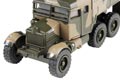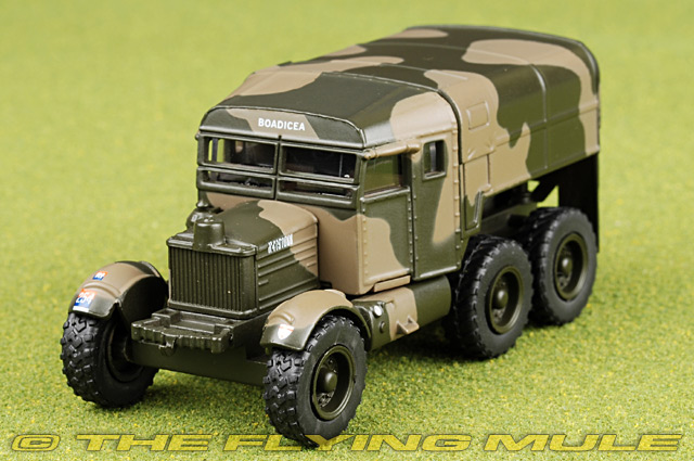 The Scammell Pioneer, produced between 1937 and 1945, served extensively throughout WWII as an artillery tractor, as well as being used as a 6 x 4 heavy breakdown vehicle. After the end of the war, the Pioneer proved most useful in civilian life in the roles of heavy haulage, forestry, fairground and recovery, lasting well into the 1980s. Our model is as used by the Royal Artillery (1st Army), who gave it the name "Boadicea", seen above the windscreen. Decorated in camouflage colours, its military insignia also feature across the back doors