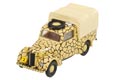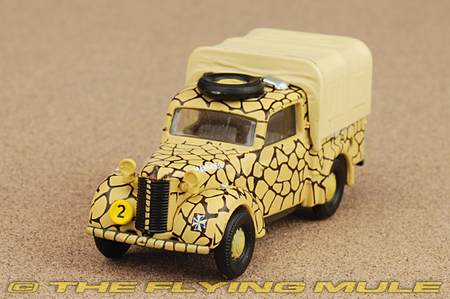 The fourth release on this WWII utility vehicle, nicknamed the Austin "Tilly" as a result, is decorated in an unusual desert style camouflage colour scheme, with the beige being repeated in the wheel hubs. The slightly lighter sand coloured "canvas" back incorporates the interesting detail of double rolled down canvas flaps on the sides, as well as a rolled up rear canvas back. The Maltese Cross is emblazoned proudly on the front wing in blue and yellow with the other authentic military markings on the front, sides and rear of the truck.