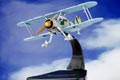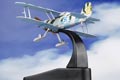 This Gloster Gladiator comes with skis, as would have been used on the real-life aircraft. There are two silver coloured skis on each underside of the front fuselage and one under the tail. The aircraft is decorated in a dark green and pale grey camouflage scheme with pale blue underside with white, blue and yellow printed graphics. One of the many fine details on the model sees the two blade propeller being given a wooden effect with yellow propeller cap.