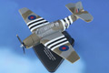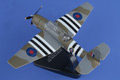 This 1:72 scale model of the Grumman Avenger Mk II is decorated in camouflage slate grey and sea grey on the upper wings and fuselage and light grey undersides. It wears the black and white invasion banding round the middle of the wings and also round the rear fuselage. The FAA roundels feature on the upper and underwings along with red, white and blue vertical stripes to the rudder fin. Note the nod to the American Grumman "Topcat" attack squadron of the cartoon cat with a torpedo in its mouth, printed on the port fuselage in front of the wing.