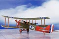This WWI 2-seater bi-plane is as flown by No. 5 Squadron of the RNAS and comes decorated with the fuselage and upper wings in a khaki green with dark red tail fin and rear fuselage banding with cream under wings. The red white and blue roundel which features the white surround on the dark background surface of the upper wings and fuselage was used between 1915-1919, whereas the white outer surround was missing when painted on light surfaces, as we show on our model. Some special features to note on our 1:72 scale replica include a single machine gun in the rear cockpit and a spinner connected to the propeller.