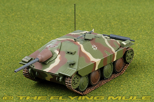 Based on a pre-WWII Panzer tank chassis, the "Hetzer" (Troublemaker) was one of the most successful German tank systems of the war. Compact, highly mobile and equipped with a powerful 75mm PaK 39 artillery gun, the Hetzer was also armoured with a thick, slope-sided hull designed to deflect incoming missiles. The Hetzer became the main German tank destroyer towards the end of WWII. Designed as a light tank destroyer based on the Panzer 38(t) chassis, the Jagdpanzer 38(t) Hetzer (or "Baiter") entered production in April 1944. By using a proven chassis, the design was more cost-effective than the Jagdpanther and Jagdtiger designs. In contrast to the earlier Marder and Nashorn tank destroyers, the Hetzer was heavily armored, featuring a 60mm front armor plate, sloped at a 60 degree angle. The orginal Jagdpanzer 38(t) carried a 75mm cannon but later variants used a 150mm howitzer, while others were outfitted with a flamethrower and redesignated Flammpanzer 38. © Copyright 2003-2025 The Flying Mule, Inc. The Panzerstahl display model range presents ready made plastic models of military vehicles. Panzerstahl display model vehicles feature: - Molded plastic construction.