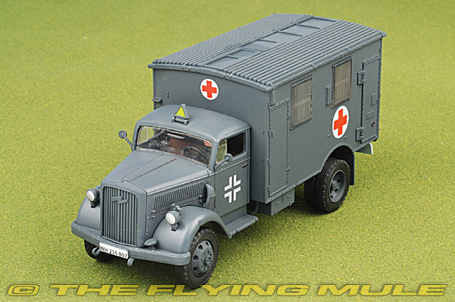 Forces of Valor's 1:32 scale Opel Kfz.305 Blitz truck is constructed with a blend of diecast metal and plastic components and is rich in scale detail. The cab is constructed in diecast metal, which provides for most of the model's weight. Side mirrors, headlights and field equipment are separately attached and constructed in plastic for maximum detail. The rear cargo area is features simulated wood grain patterns, and the removable cover has hand-painted window straps and the look and feel of canvas material stretched over support beams. The drive train is meticulously recreated, and equipment boxes, rack and a spare tire are mounted under the bed.
