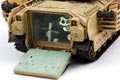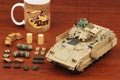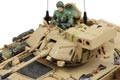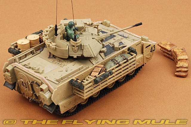 Forces of Valor's 1:32 scale Bradley is intelligently designed; the top portion of the hull and turret are constructed in diecast metal, with plastic components used in those areas requiring maximum detail. Moving parts include a 360 degree rotating turret, opening crew hatches, rolling rubber tracks and wheels with active suspension and a rear door that can be lowered to reveal interior details. A 25mm chain gun with articulating aerial gun sight pivots in unison with a 7.63 machine gun, and the turret-mounted TOW missile system has an articulating front seal and can be raised to firing position. A variety of battlefield equipment is included for enhanced display.