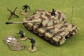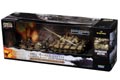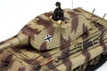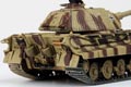 Forces of Valor's 1:72 scale King Tiger Tank is constructed from diecast metal, with plastic used only in highly-detailed areas such as the welding seams, engine exhaust and spare tracks. This model features a simulated Zimmerit coating, and the all-metal hull has battle damaged fenders, hand-painted tools and equipment, detailed engine intake, exhaust vent, maintenance hatches and suspension. The large Porsche turret rotates 360 degrees and has an elevating 88mm metal cannon and a hand-painted commander figure. The underside features wide rolling rubber tracks and interleaved wheels with bolt head details.