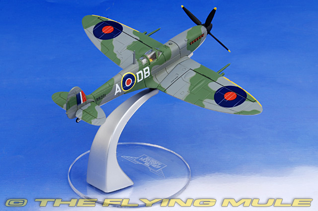 Corgi's 1:72 scale Spitfire series includes many versions of this famous aircraft, from Mk I to the Griffon-engined variants with five bladed propellers. The characteristic under-wing mounted pitot tube and offset radiator and oil cooler ducts are mounted below the solid metal wings with a variety of machine guns and cannons. The all metal horizontal stabilizers and rudder feature simulated fabric stretched control surfaces. On some releases, the top engine cowing is removable to reveal engine detail engine and exhaust detail. The model is constructed almost entirely of solid diecast metal and feels surprisingly heavy in this scale.