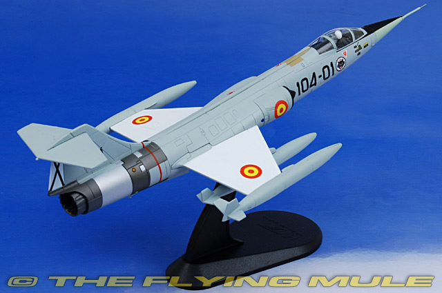 Hobby Master's 1:72 scale F-104 Starfighter is a good looking model with many quality features. The exceptionally long fuselage is constructed in diecast metal, with plastic side-mounted engine intakes. The rear turbine blades and the exhaust with its "turkey feathers" are some of the high points of this model, along with a canopy that opens to reveal an ejection seat and pad printed front and side instrument panels. The M61 Vulcan Gatling gun port is beautifully recreated, and the complex main landing gear is accurately rendered, securely locking into place for ground display. Most releases include removable wingtip fuel tanks, with fuselage mounted missiles on some versions.