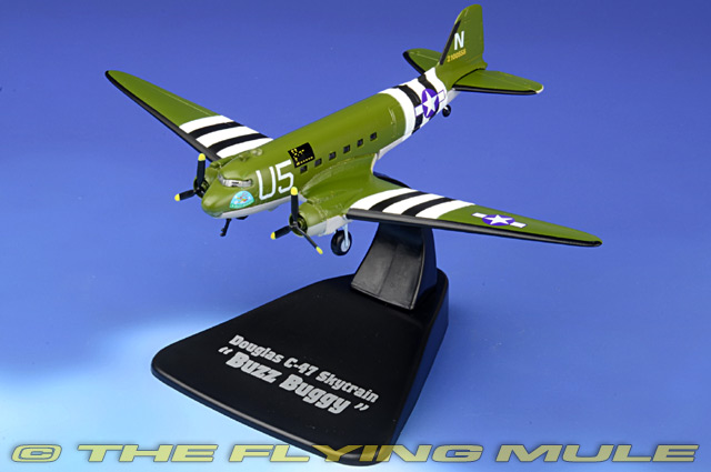 Developed from the Douglas DC-3 airliner, the C-47 military transport variant served with the USAAF in a variety of roles including the airlifting of supplies and cargo, casualty evacuation, glider towing and perhaps most famously dropping paratroopers into combat zones. The subject of our model, C-47A-65-DL, serial number 42-100558 was built by the Douglas Aircraft Company in Long Beach, California, one of over 10,000 military versions produced by factories in the United States. Based at Membury in Berkshire, England from 1944 and given the nickname and nose art of 'Buzz Buggy', this C-47 served with the 81st Troop Carrier Squadron, 436th Troop Carrier Group and participated in the airborne assaults on Normandy, southern France Holland and Germany. In 1950 after an illustrious career with the USAAF, 'Buzz Buggy' was transferred to the Uruguayan Air Force before being scrapped following an accident in 1959. Designed to meet an American Airlines requirement for an enlarged version of the DC-2, the DC-3 was first flown on December 17th, 1935. Capable of carrying 24 passengers at a cruising speed of 180 mph, the DC-3's speed and long range revolutionized commercial air travel in the 1930s and 40s, when it carried 90 percent of the world's air travelers. Early DC-3s used Wright R-1820 Cyclone engines, but Pratt & Whitney R-1830 Twin Wasp Radials were fitted to later versions; these engines had better single engine performance and allowed the DC-3 to fly at higher altitudes. © Copyright 2003-2025 The Flying Mule, Inc. The Atlas Editions "Bombers of World War II" range presents affordable, ready made diecast models of military aircraft in 1:144 scale. Atlas Editions diecast airplanes feature: - Diecast metal and plastic construction.
