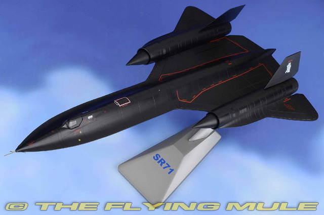 Aircraft #61-7974 has the unfortunate distinction of being the last SR-71 to be lost, ending an 18 year accident-free streak for its type; the longest of any USAF aircraft. The accident occurred on April 21st, 1989 when the right engine exploded after take-off from Kadena, severing hydraulic lines and disabling flight controls. After an initial attempt to regain control of the aircraft for a single-engine emergency landing, the crew were forced to eject, leaving the crippled aircraft to crash off the coast of Luzon in the Philippines. Designed as a long-range, strategic reconnaissance aircraft, The Lockheed SR-71 first flew on December 22, 1964. Nicknamed "The Blackbird," this highly-advanced aircraft was believed by many to be ahead of its time. It was capable of mach 3 and still holds the record for the fastest "air breathing manned aircraft" in the world. Its speed and ability to operate at high altitudes served as a defensive feature; when attacked by surface-to-air missiles, the pilot needed only to accelerate to avoid being struck. Only 32 SR-71's were operated during its 34-year service history, and though 12 were destroyed in accidents none were lost to enemy attack. © Copyright 2003-2025 The Flying Mule, Inc. The Air Force 1 range presents detailed, ready-made diecast models of military aircraft. Air Force 1 (Series 2) diecast airplanes feature: - Diecast metal construction with some plastic components.