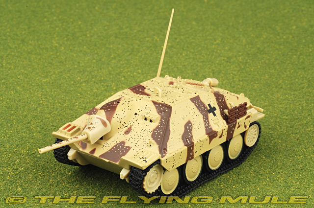 Based on a pre-WWII Panzer tank chassis, the "Hetzer" (Troublemaker) was one of the most successful German tank systems of the war. Compact, highly mobile and equipped with a powerful 75mm PaK 39 artillery gun, the Hetzer was also armoured with a thick, slope-sided hull designed to deflect incoming missiles. The Hetzer became the main German tank destroyer towards the end of WWII. Designed as a light tank destroyer based on the Panzer 38(t) chassis, the Jagdpanzer 38(t) Hetzer (or "Baiter") entered production in April 1944. By using a proven chassis, the design was more cost-effective than the Jagdpanther and Jagdtiger designs. In contrast to the earlier Marder and Nashorn tank destroyers, the Hetzer was heavily armored, featuring a 60mm front armor plate, sloped at a 60 degree angle. The orginal Jagdpanzer 38(t) carried a 75mm cannon but later variants used a 150mm howitzer, while others were outfitted with a flamethrower and redesignated Flammpanzer 38. © Copyright 2003-2026 The Flying Mule, Inc. The Amercom "Combat Vehicles" range presents affordable, ready made diecast models of light military vehicles in 1:72 scale. These arrive in low-cost, discardable blister type packaging. Amercom "Combat Vehicles" diecast vehicles feature: - Diecast metal and plastic construction.