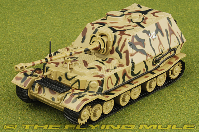 Presented to Hitler on March 19th, 1943, the German Panzerjäger or Elefant was originally built under the name Ferdinand, after its designer Ferdinand Porsche. A six man crew operated the 88mm gun mounted on this 70 ton tank. Engines were located in the middle of the hull, which allowed space for the armament at the rear. The Elefant's armor plate was as thick as 8 in. on the front-this helped it flatten obstacles and clear the way for lighter vehicles. The Elefant's extreme firepower/protection ratio gave it an enormous advantage; in "kills per loss," it might have been the most successful "tank destroyer" of the war. © Copyright 2003-2026 The Flying Mule, Inc.