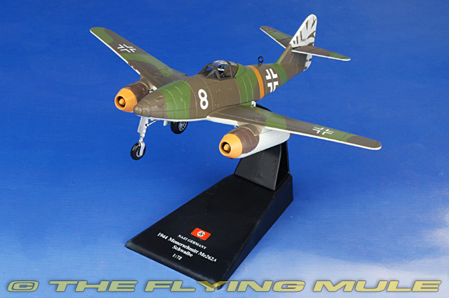 | Messerschmitt Me 262A | | 5.75" | | 6.75" | Designed to meet Adolph Hitler's vision of a high-speed, light-payload ground attack bomber, the Me 262 was first flown on April 18, 1941. As the world's first operational jet aircraft, development of the 262 was dominated by confusion, with Hitler envisioning a bomber and designers envisioning a jet fighter. Capable of outpacing the P-51 Mustang by 120 miles per hour, the 262 was clearly the best fighter plane to serve in WWII but was too late to help the Luftwaffe. Its specialized maintenance requirements and fuel shortages, coupled with aggressive Allied ground attacks prevented it from having any serious impact on the outcome of the war. © Copyright 2003-2025 The Flying Mule, Inc. The Amercom "1:72 Aircraft of the World" range presents affordable, ready made diecast models of military aircraft in 1:72 scale. To help keep the price down, these items arrive in low-cost, discardable blister type packaging. Amercom "Aircraft of the World" diecast airplanes feature: - Diecast metal and plastic construction.