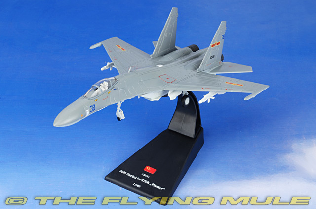 | Sukhoi Su-27SK Flanker-C | | 8.75" | | 5.75" | Designed by the Soviet Union to challenge the superiority of fourth generation US fighters such as the F-15 Eagle, the Su-27 was first flown on May 20, 1977. This one seat Mach-2 fighter had the Soviet Union's first operational fly-by-wire system. The aircraft is very large compared to the MiG-29, its closest Soviet counterpart, but it is built with a high percentage of titanium, which helps minimize its weight. It is exceptionally agile and is perhaps most famous for its "Cobra" maneuver, which is a short, sustained level flight at a 120 degree angle of attack, often performed at air shows. © Copyright 2003-2026 The Flying Mule, Inc. The Amercom "1:100 Aircraft of the World" range presents affordable, ready made diecast models of military aircraft in 1:100 scale. To help keep the price down, these items arrive in low-cost, discardable blister type packaging. Amercom "Aircraft of the World" diecast airplanes feature: - Diecast metal and plastic construction.