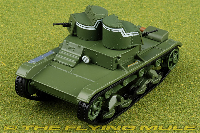 The T-26 tank was a Soviet light infantry tank used during many conflicts of the 1930s and in World War II. It was a development of the British Vickers 6-Ton tank and was one of the most successful tank designs of the 1930s until its light armour became vulnerable to newer anti-tank guns. Like its British counterpart, the T-26 mod. 1931 had a twin-turreted configuration and was designed to carry two machine guns, mounting one in each turret. A major difference was that the Soviet T-26 mod. 1931 had higher turrets (with an observation slit) than the British 6-Ton. Soviet turrets had a round firing port for the DT tank machine gun, as opposed to the rectangular ports used by the original British design for the Vickers machine gun. The front part of the hull was also slightly modified.
