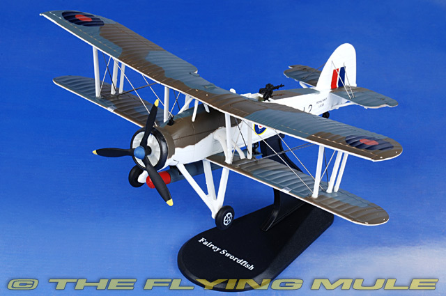 Fairey Swordfish LS326 had a brief, but fascinating World War II service career. LS326 debuted in late 1943 with the Merchant Aircraft Carrier ship parent squadron, No. 836 Naval Air Squadron, based in Northern Ireland and, later, operated from Merchant aircraft carrier Empire MacCallum and flew dangerous anti-submarine sorties to protect trans-Atlantic convoys off the coast. After the war, she found her way to the Royal Navy Historic Flight. This spotter-reconnaissance aircraft, built by the Fairey Aviation Company for the British Royal Navy, was first flown on February 22nd, 1934. Nicknamed "Stringbag" after a housewife's string shopping bag, the Swordfish could carry an unlikely combination of loads. It could lift off a carrier deck with a standard torpedo, although this made it vulnerable to fighter attack. Its low speed and stable stance made it easy to line up for a torpedo attack, as it did against the German Bismark and on the Italian naval base at Taranto, where 21 Swordfish destroyed three battleships, a cruiser, two destroyers and other warships. © Copyright 2003-2025 The Flying Mule, Inc. The Aviation 72 range presents affordable, ready-made diecast models of military aircraft. Aviation 72 diecast airplanes feature: - Diecast metal construction with some plastic components.