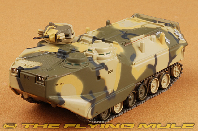 The Assault Amphibious Vehicle (AAV)-official designation AAV-P7/A1 (formerly known as Landing Vehicle, Tracked, Personnel-7 abbr. LVTP-7)-is a fully tracked amphibious landing vehicle manufactured by U.S. Combat Systems (previously by United Defense, a former division of FMC Corporation) and FNSS Defence Systems. The AAV-P7/A1 is the current amphibious troop transport of the United States Marine Corps. It is used by U.S. Marine Corps Assault Amphibian Battalions to land the surface assault elements of the landing force and their equipment in a single lift from assault shipping during amphibious operations to inland objectives and to conduct mechanized operations and related combat support in subsequent mechanized operations ashore. It is also operated by other forces. Marines call them "amtracks," a shortening of their original designation, "amphibious tractor." Designed to replace the LVT-5, the AAV-7 was introduced in 1972 as the LVT-7. A decade after its appearance, the LVT-7 was given an improved engine, weapons system and transmission and was renamed AAV-7A1. Armed with an M2HB .50 caliber machine gun and capable of transporting 25 combat-equipped troops, this Amphibious Assault Vehicle is used by the United States Marine Corps for landing amphibious operations. Its long service history has included the Falkland Island invasion, the Persian Gulf War and the second Iraq War, though it has recently been criticized for failing to protect troops as well as newer vehicles such as the M2 Bradley. © Copyright 2003-2025 The Flying Mule, Inc. The Altaya "Armored Fighting Vehicles" range presents affordable, ready made diecast models of military vehicles in 1:72 scale. To help keep the price down, these items arrive in low-cost, discardable blister type packaging. Altaya "Armored Fighting Vehicles" diecast vehicles feature: - Diecast metal and plastic construction.