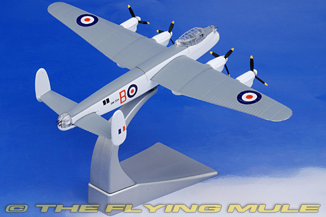 | Avro Lancaster B.Mk III | | 5.75" | | 8.5" | Designed to meet a specification for a new generation of "worldwide use" medium bombers, the Avro Lancaster was first flown on January 8, 1941. The design of the Lancaster evolved from an unsuccessful two-engine aircraft called the Manchester. The heavier Lancaster had four engines and an extensive bomb bay, with later versions capable of carrying 22,000 lb bombs. Used primarily as a night bomber, the Lancaster was a versatile aircraft that became most famous for its role in the 1943 "Dam Buster" raids on Germany's Ruhr Valley dams. Between 1942 and 1945, Lancasters flew 156,000 sorties, dropping 608,612 tons of bombs on enemy targets. © Copyright 2003-2025 The Flying Mule, Inc. Corgi's 1:144 scale Lancaster is constructed almost entirely of solid diecast metal with only the smallest amount of plastic used, a quality common to most of Corgi's 1:144 series aircraft. The cockpit canopy, dorsal mounted turret and forward and rear gunner's canopy feature transparent windows, which is uncommon in smaller scales. All machine gun stations include a sturdy all-metal machine gun barrel that won't bend or break. Exhaust detail is present on the engine nacelles behind the thinly stamped all-metal propellers. Landing gear installs quickly and easily for ground display and a multi-positional display stand is included on most models (see photos). © Copyright 2003-2014 The Flying Mule, Inc. The Corgi "Aviation Archive" range presents highly-detailed, ready-made diecast models of military and civilian aircraft. The vast Aviation Archive range has become the standard by which all other diecast airplane ranges are judged. Each Corgi model is based on a specific aircraft from an important historical or modern era of flight, and has been authentically detailed from original documents and archival library material. Famous airplanes and aviators from both military and commercial airline aviation are all honored. Corgi "Aviation Archive" diecast airplanes feature: - Diecast metal construction with some plastic components.