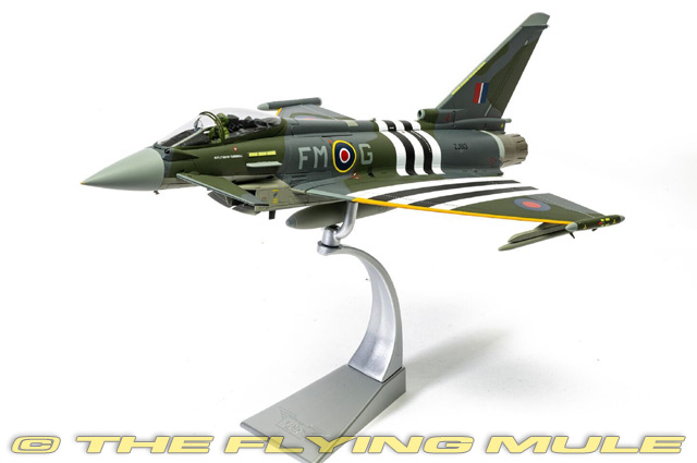 Those who enjoy attending UK airshows in the summer will agree that the highest profile individual aircraft in current Royal Air Force service is their display Typhoon, an aircraft which makes a celebrity of its pilot for the season and attracts thousands of youngsters to consider a career in the RAF. Over recent years, it has become tradition for the RAF Display Team's Typhoon display jet to wear attractive special markings, making the aircraft a highlight display act on any airshow programme, and one of the most appealing subjects for enthusiast photographers. To mark 2024's 80th anniversary of D-Day commemorations, the RAF presented Eurofighter Typhoon ZJ913 in the markings of a Second World War Hawker Typhoon of No.257 (Burma) Squadron. The livery represents a plane flown by Squadron Leader Denzil Jenkins in support of the D-Day landings in summer 1944. During the airshow season, at commemorative events in both the UK and France and a successful Canadian tour, the aircraft, which its support team and enthusiasts referred to as "Moggy", displayed the legendary agility of the Eurofighter Typhoon and highlighted the professionalism of the modern Royal Air Force in style. Although now retired to perform duties as an instructional airframe, "Moggy" will be remembered as one of the most popular RAF aircraft of the post-war era. Designed as part of a co-operative effort by Germany, Italy and the UK to produce an air superiority fighter, the Eurofighter was first flown on March 27th, 1994. The Eurofighter is a single-seat, twin-engine, agile combat aircraft used in air-to-air, air-to-ground and tactical reconnaissance roles. It is intentionally aerodynamically unstable, which gives it its high levels of agility-but this means the Typhoon is controlled by a computerized "fly by wire" system instead of by its pilot. The Eurofighter's first rate performance is matched by excellent all round vision and by sophisticated attack, identification and defense systems and stealth technology. © Copyright 2003-2025 The Flying Mule, Inc. The Corgi "Aviation Archive" range presents highly-detailed, ready-made diecast models of military and civilian aircraft. The vast Aviation Archive range has become the standard by which all other diecast airplane ranges are judged. Each Corgi model is based on a specific aircraft from an important historical or modern era of flight, and has been authentically detailed from original documents and archival library material. Famous airplanes and aviators from both military and commercial airline aviation are all honored. Corgi "Aviation Archive" diecast airplanes feature: - Diecast metal construction with some plastic components.