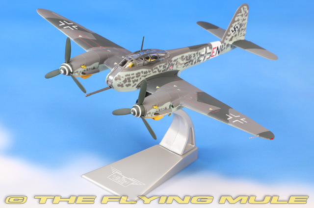 The culmination of Germany's vaunted "Destroyer" concept, the Messerschmitt Me 410 was the intended successor of the Messerschmitt Bf 110 heavy fighter. Despite entering service almost two years late, it was arguably the Luftwaffe aircraft which most closely matched Britain's magnificent de Havilland Mosquito in terms of role and performance. Equipped with the mighty Rheinmetall manufactured BK-5 autocannon which protruded from the nose of the fighter, this weapon was a development of the 50mm Kampfwagenkanone anti-tank gun found in Panzer III tanks. With 21 shells housed in a magazine in the weapons bay of the fighter and a shell already loaded in the breach ready to fire, the pilot could usually only rely on one round being fired, before this temperamental system jammed, leaving just reduced standard armament to be used during the sortie. A single, well-aimed shell did possess the destructive power to easily bring down an Allied bomber and could be fired at ranges where the attacking Luftwaffe aircraft were effectively impervious to the wall of return fire put up by the bomber stream. However, the additional weight and drag caused by using this powerful gun made the Me 410 incredibly vulnerable to marauding Allied fighters. Designed as a heavy fighter and fast bomber, the Me 410 was first flown on March 14th, 1942. An evolution of the troubled Me 210, the Me 410 featured more powerful Daimler-Benz DB 603 engines and improved aerodynamics, offering better speed and stability. Armed with a mix of forward-firing cannons and remote-controlled defensive machine guns, it was used in bomber-destroyer and reconnaissance roles. Despite its performance, it struggled against nimble Allied fighters like the P-51 Mustang. Produced in limited numbers from 1943 to 1944, the Me 410 was ultimately overshadowed by Germany's increasing reliance on jet and rocket aircraft late in the war. © Copyright 2003-2026 The Flying Mule, Inc. The Corgi "Aviation Archive" range presents highly-detailed, ready-made diecast models of military and civilian aircraft. The vast Aviation Archive range has become the standard by which all other diecast airplane ranges are judged. Each Corgi model is based on a specific aircraft from an important historical or modern era of flight, and has been authentically detailed from original documents and archival library material. Famous airplanes and aviators from both military and commercial airline aviation are all honored. Corgi "Aviation Archive" diecast airplanes feature: - Diecast metal construction with some plastic components.
