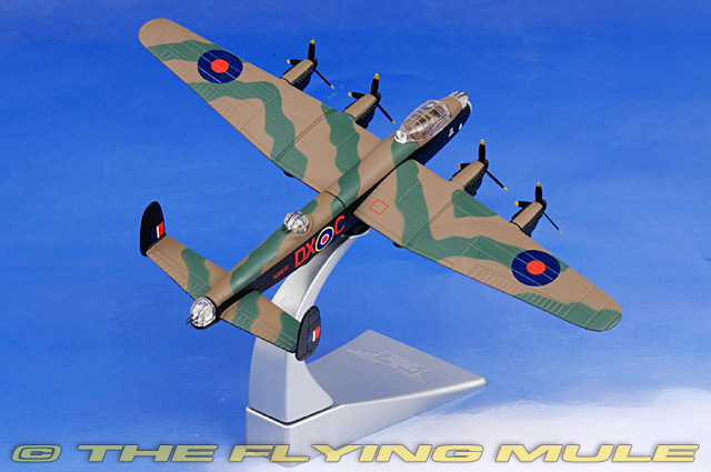 Corgi's 1:144 scale Lancaster is constructed almost entirely of solid diecast metal with only the smallest amount of plastic used, a quality common to most of Corgi's 1:144 series aircraft. The cockpit canopy, dorsal mounted turret and forward and rear gunner's canopy feature transparent windows, which is uncommon in smaller scales. All machine gun stations include a sturdy all-metal machine gun barrel that won't bend or break. Exhaust detail is present on the engine nacelles behind the thinly stamped all-metal propellers. Landing gear installs quickly and easily for ground display and a multi-positional display stand is included on most models (see photos).