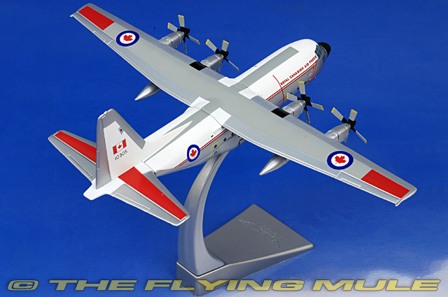 Corgi's 1:144 scale C-130 is constructed almost entirely of diecast metal with only the smallest amount of plastic used. The model's wide fuselage and carefully rendered nose section is solid, and pad-printed windows and doors provide a seamless touch that does not interrupt the lines of the aircraft. The solid metal wing features external fuel tanks and thinly stamped metal propellers. This series includes many versions, from gunship to search and rescue, scientific research support and aerial refueling to maritime patrol. The series includes almost all variants, from the early three-bladed propeller "A" to the current "J" variant with upgraded engines and six-bladed propellers.