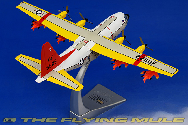 Corgi's 1:144 scale C-130 is constructed almost entirely of diecast metal with only the smallest amount of plastic used. The model's wide fuselage and carefully rendered nose section is solid, and pad-printed windows and doors provide a seamless touch that does not interrupt the lines of the aircraft. The solid metal wing features external fuel tanks and thinly stamped metal propellers. This series includes many versions, from gunship to search and rescue, scientific research support and aerial refueling to maritime patrol. The series includes almost all variants, from the early three-bladed propeller "A" to the current "J" variant with upgraded engines and six-bladed propellers.