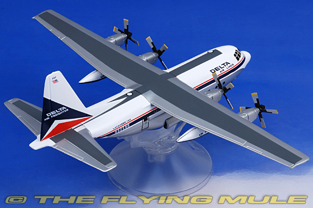 Corgi's 1:144 scale C-130 is constructed almost entirely of diecast metal with only the smallest amount of plastic used. The model's wide fuselage and carefully rendered nose section is solid, and pad-printed windows and doors provide a seamless touch that does not interrupt the lines of the aircraft. The solid metal wing features external fuel tanks and thinly stamped metal propellers. This series includes many versions, from gunship to search and rescue, scientific research support and aerial refueling to maritime patrol. The series includes almost all variants, from the early three-bladed propeller "A" to the current "J" variant with upgraded engines and six-bladed propellers.