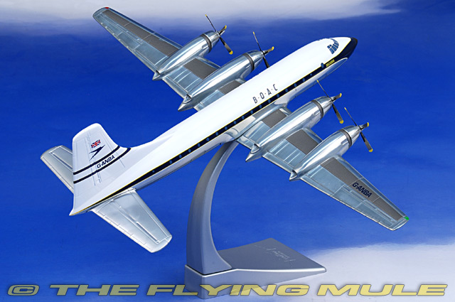 Corgi's 1:144 scale Bristol Britannia is constructed almost entirely of solid diecast metal with only the smallest amount of plastic, a quality common to most of Corgi's 1:144 series aircraft. The large rudder and top portion of model's fuselage are cast as one solid piece, and pad-printed windows and doors provide a seamless touch that does not interrupt the lines of the aircraft. The solid diecast metal wing features large engine nacelles and thinly stamped propellers. Wheels-down configuration of the model is easy with landing gear that installs quickly, and air stairs are included for enhanced ground display (on some releases; see photos).