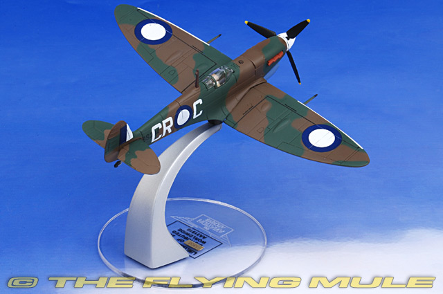 Corgi's 1:72 scale Spitfire series includes many versions of this famous aircraft, from Mk I to the Griffon-engined variants with five bladed propellers. The characteristic under-wing mounted pitot tube and offset radiator and oil cooler ducts are mounted below the solid metal wings with a variety of machine guns and cannons. The all metal horizontal stabilizers and rudder feature simulated fabric stretched control surfaces. On some releases, the top engine cowing is removable to reveal engine detail engine and exhaust detail. The model is constructed almost entirely of solid diecast metal and feels surprisingly heavy in this scale.