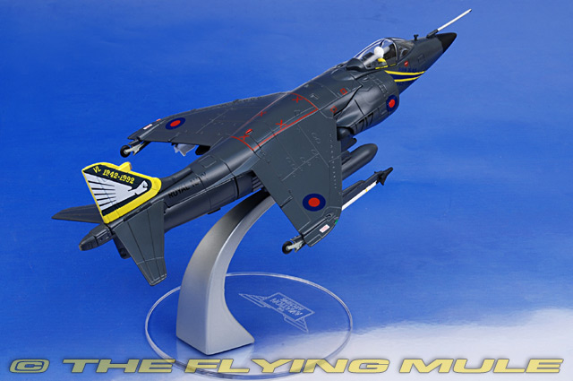 Corgi's 1:72 scale Harrier series includes the early GR.1, the upgraded GR.3 and the FRS.1 Sea Harrier. Each version features a different nose style, and a radar warning receiver has been added to the fins of the later two variants. The large canopy provides a clear view of a detailed pilot figure, with details of the massive turbofan compressor blades clearly visible through the air intake behind the cockpit. All four exhaust nozzles rotate in unison, with simulated heat shielding on the rear nozzles. Each release features drop tanks and two ventral mounted cannon pods, and a Matra rocket pod or AS-37 missiles have been included on some releases.