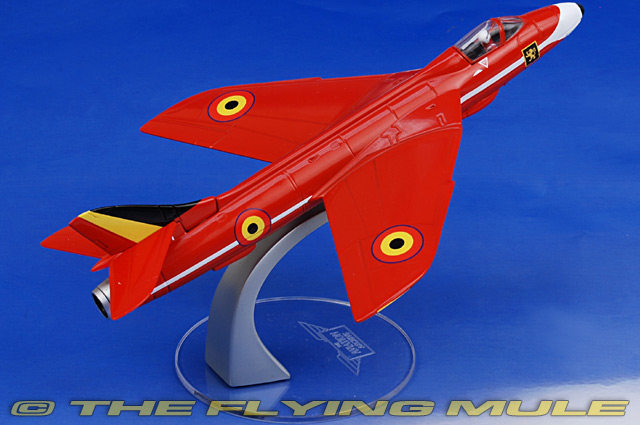Corgi's 1:72 scale Hunter series spans the long history of this aircraft, from its use during the cold war to its role in military aerobatics. The model is heavy, constructed with only the smallest amount of plastic. The canopy is removable, revealing an intricately detailed pilot figure. Large port collector blisters are easily seen below the cockpit, with four cannon ports located forward. The ventral mounted speed brake is easy to configure in either deployed or closed configurations. Keyed landing gear provides an uncomplicated configuration for ground display. F9 and late F6 variants feature housing over the tailpipe for the braking parachute.
