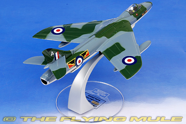 Corgi's 1:72 scale Hunter series spans the long history of this aircraft, from its use during the cold war to its role in military aerobatics. The model is heavy, constructed with only the smallest amount of plastic. The canopy is removable, revealing an intricately detailed pilot figure. Large port collector blisters are easily seen below the cockpit, with four cannon ports located forward. The ventral mounted speed brake is easy to configure in either deployed or closed configurations. Keyed landing gear provides an uncomplicated configuration for ground display. F9 and late F6 variants feature housing over the tailpipe for the braking parachute.