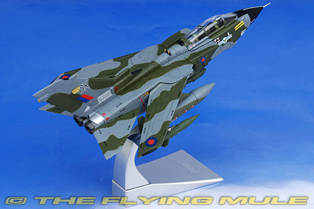 Corgi's 1:72 scale Tornados feature the distinctively large tail fin that gives the real aircraft its nickname, "The Fin". The models also incorporates an articulating swing-wing design that can be configured in varying sweep positions, movable elevators that rotate in unison, and simulated stainless-steel heat shielding around the detailed engine exhaust. The wing mounted fuel tanks and ordnance can be positioned to fit any swept-wing configuration, and the repositionable canopy opens to reveal pilot figures and cockpit detail, including the distinctive embedded cordite charge used to shatter the canopy during the ejection sequence. The mold itself is exceptionally rich in detail, with every access panel and antenna faithfully reproduced. Pad-printed unit markings and placards provide the finishing touches.