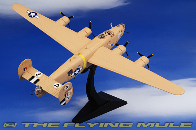 One of the Mediterranean Theatre of Operation's (MTO) most famous B-24's was 'Strawberry Bitch'. Depicted here in the camouflaged desert pink scheme applied to North Africa based Liberators in 1942-43, it wears a command stripe around its fuselage. 'Strawberry Bitch' survived the legendary Ploesti Raid of August 1943. A combined Liberator force from the Ninth and Eighth Air Force left North Africa destined for the giant German refineries at Ploesti, dedicated to destroying as much of these as possible and handicapping the German ability to fuel its combat forces. Despite suffering heavy losses the mission was a massive success and inflicted vast amounts of damage on major portions of the oil fields. Of the one hundred and seventy nine Liberators that left forty three were lost and a further fourteen aborted. Five hundred and thirty two aviators lost their lives. Designed to fill a United States Army Air Corps need for a heavy bomber, the B-24 Liberator was first flown on December 29, 1939. The USAAC originally asked Consolidated to build the B-17 under license, but the company instead chose to submit a more modern design with greater speed, greater range and a heavier bomb load. Despite these advantages, the B-24 was more difficult to fly, had poor formation-flying characteristics, and was much more vulnerable to battle damage, which meant it never became the favored bomber among American aircrews. It did prove more than serviceable, however, especially for long-range missions. © Copyright 2003-2025 The Flying Mule, Inc. Corgi's 1:72 scale B-24 series includes the early war B-24D and late war B-24H and B-24J variants, with the notable addition of a nose gun turret and retractable ball turret. Corgi's WWII heavy bombers are some of the most sought after diecast models available in 1:72 scale. The large size and spot on recreation of the Liberator's distinctive shape has lead to this mold's popularity, along with such subtle details as simulated fabric control surfaces. The mold incorporates a large number of diecast components and includes a heavily constructed all metal display-stand is included to support this massive aircraft for in-flight display. © Copyright 2003-2013 The Flying Mule, Inc. The Corgi "Aviation Archive" range presents highly-detailed, ready-made diecast models of military and civilian aircraft. The vast Aviation Archive range has become the standard by which all other diecast airplane ranges are judged. Each Corgi model is based on a specific aircraft from an important historical or modern era of flight, and has been authentically detailed from original documents and archival library material. Famous airplanes and aviators from both military and commercial airline aviation are all honored. Corgi "Aviation Archive" diecast airplanes feature: - Diecast metal construction with some plastic components.