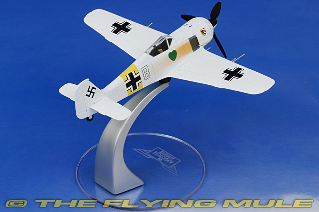 Corgi's 1:72 scale Fw 190A series includes models from all major theaters of action, from the Channel Front to the deserts of North Africa. Corgi has captured the many unique features of this aircraft, including the 12 bladed fan inside the engine cowl that spins in unison with the propeller to cool the engine. The solid metal tail and wings feature simulated fabric-stretched control surfaces. On releases with configurable landing gear or gear fixed in the down position, inner details of the wing's construction and barrels of the inboard cannons can be seen inside the wheel wells, with vents for spent shell casing behind.