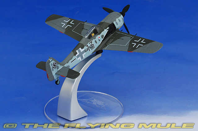 Corgi's 1:72 scale Fw 190A series includes models from all major theaters of action, from the Channel Front to the deserts of North Africa. Corgi has captured the many unique features of this aircraft, including the 12 bladed fan inside the engine cowl that spins in unison with the propeller to cool the engine. The solid metal tail and wings feature simulated fabric-stretched control surfaces. On releases with configurable landing gear or gear fixed in the down position, inner details of the wing's construction and barrels of the inboard cannons can be seen inside the wheel wells, with vents for spent shell casing behind.