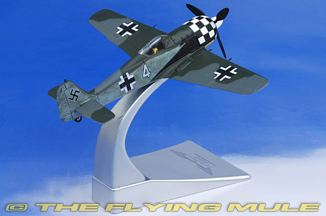 Corgi's 1:72 scale Fw 190A series includes models from all major theaters of action, from the Channel Front to the deserts of North Africa. Corgi has captured the many unique features of this aircraft, including the 12 bladed fan inside the engine cowl that spins in unison with the propeller to cool the engine. The solid metal tail and wings feature simulated fabric-stretched control surfaces. On releases with configurable landing gear or gear fixed in the down position, inner details of the wing's construction and barrels of the inboard cannons can be seen inside the wheel wells, with vents for spent shell casing behind.