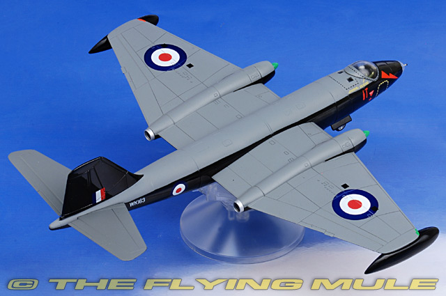 Corgi's 1:72 scale Canberra is one of the largest of any jet models available in this scale, similar in size to a WWII heavy bomber. The massive wing with its long integrated engine nacelles features turbofan and exhaust details at the rear. The robust landing gear with actuator and is easy to install and locks into place for ground display. The nose has a transparent bomb-aimers window, a large bubble fighter-style canopy and a pilot figure. The series includes both early and late variants with a heavily offset tear drop canopy featured on the later variant.