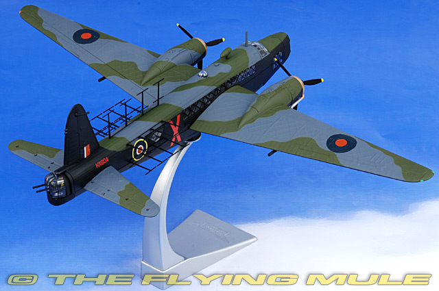 Corgi's 1:72 scale Wellington series is most notable for its replication of the "geodesic" type construction, similar to the construction method used to build airships. This construction method is replicated on the simulated fabric stretched wings and tail surfaces, and is clearly visible through the windows on the fuselage. Releases with configurable bomb load subassemblies have open bombay doors that expose an internal bomb load. The robust metal landing gear are quick and easy to install for ground display. Each release features a 90 degree rotating gunner's turret, and some include an array of delicate photo etched metal antennas.