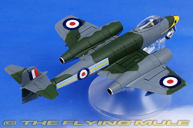 Corgi's 1:72 scale Meteor series includes both early and late variants of the F. Mk 8. The early F 8 variant features longer engine nacelles and obstructed visibility behind the pilot, with the later featuring shorter engine nacelles with a larger intake and a full canopy. Four 20mm cannon guns—the aircraft's main weapons—are visible just below the cockpit. Some releases include rockets mounted under the outer wings, and some include a ventral mounted fuel tank with under-wing tanks. The stout metal landing gear with splash guard fenders are easy to install for ground display.
