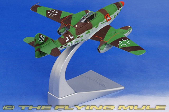 Corgi's 1:72 scale Me 262s feature highly detailed inlet and exhaust nacelles. Four cannon ports are detailed on the upper side of the nose with associated shell-casing ejection ports molded underneath. When configured for ground display, exceptional detail can also be seen inside the wheel wells. Corgi's 262 series includes the single-seat A-model and the two-seat B-model. A hand painted pilot figure wearing the typical German fighter pilot uniform, with black leather helmet and jacket, completes this model.