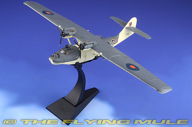 Corgi's 1:72 scale PBYs feature massive observation blister-windows located aft, with a variety of crew and machine gun configurations in each release. These windows provide a clear view of the bulkhead leading to the main cabin, walkway and hull construction ribs. There are articulating outrigger pontoons and a massive wing, with details such as simulated fabric-covered control surfaces. Transparent lens covers are separately applied to the large landing lights on each wing's leading edge. The series includes a flying boat variant, with detachable "beaching gear," as well as an amphibious variant which can be configured with extended or retracted landing gear.